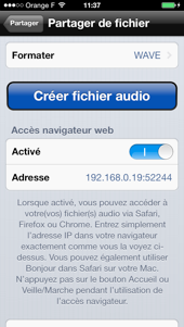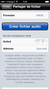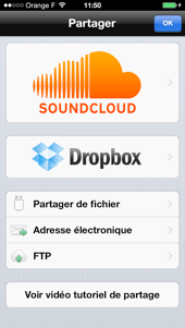 Ce type de transfert par «Bonjour» ne fonctionne qu’une fois connecté à un réseau WIFI. Si vous êtes sur un réseau 3G ou 4G, d’autres possibilités de transfert sont proposées par serveur «ftp», par email, par Dropbox ou Soundcloud. Attention à la taille des fichiers audio (plusieurs dizaines de Méga-octets), car celle-ci, excessive, peut compromettre l’envoi par message électronique.