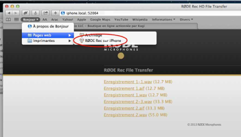 Nous avons utilisé le logiciel «RØDE Rec» lors de nos enregistrements (http://www.rodemic.com/software/roderec). Cette application IOS possède une facilité de partage de fichier sur réseau. Dès l’instant que l’iPhone est connecté à un réseau WIFI, le navigateur d’un autre ordinateur (portable ou de bureau) connecté à ce même réseau s’offre la possibilité de lister le contenu du répertoire regroupant les fichiers générés par l’application «RØDE Rec». Ceci est de loin la procédure la plus pratique et la plus directe; les étapes sont les suivantes :